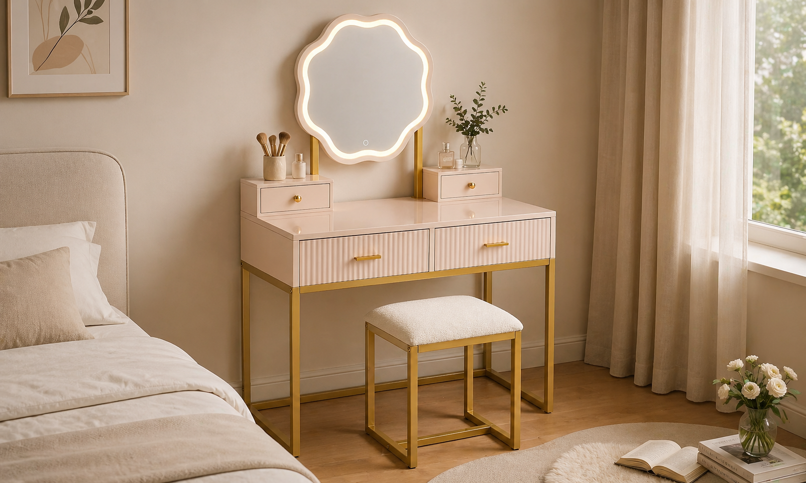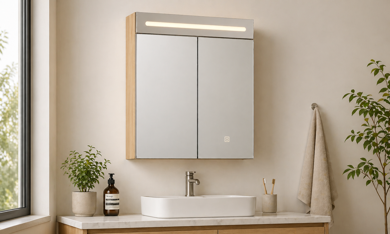 Espejo redondo integrado que aporta amplitud visual y funcionalidad diaria.