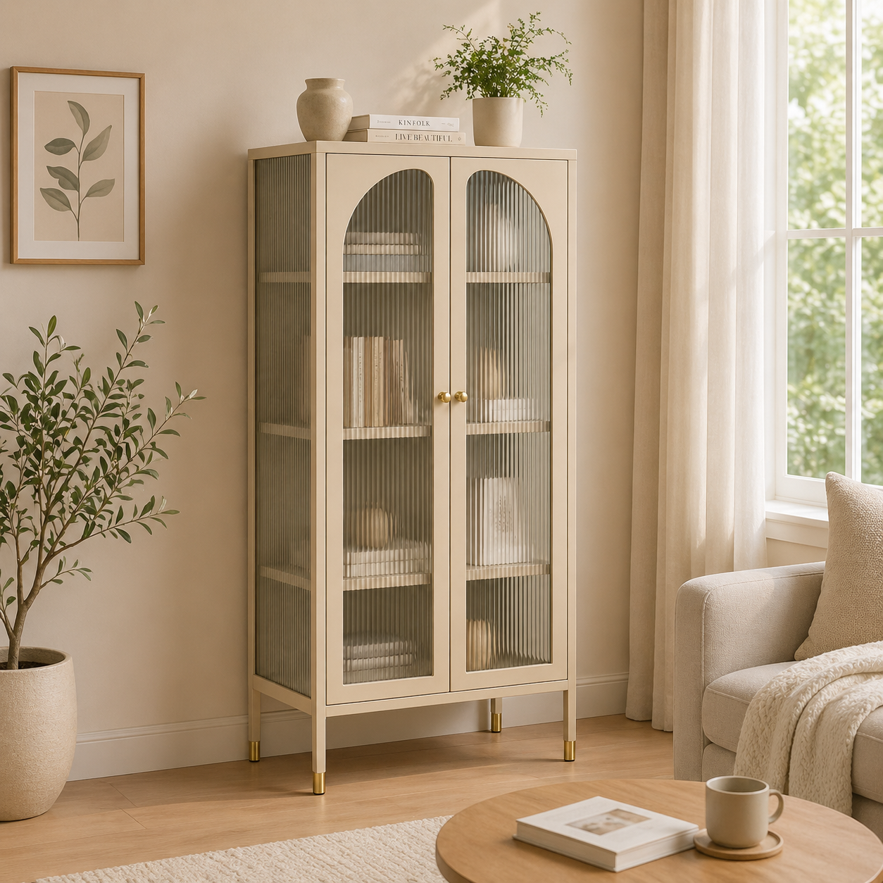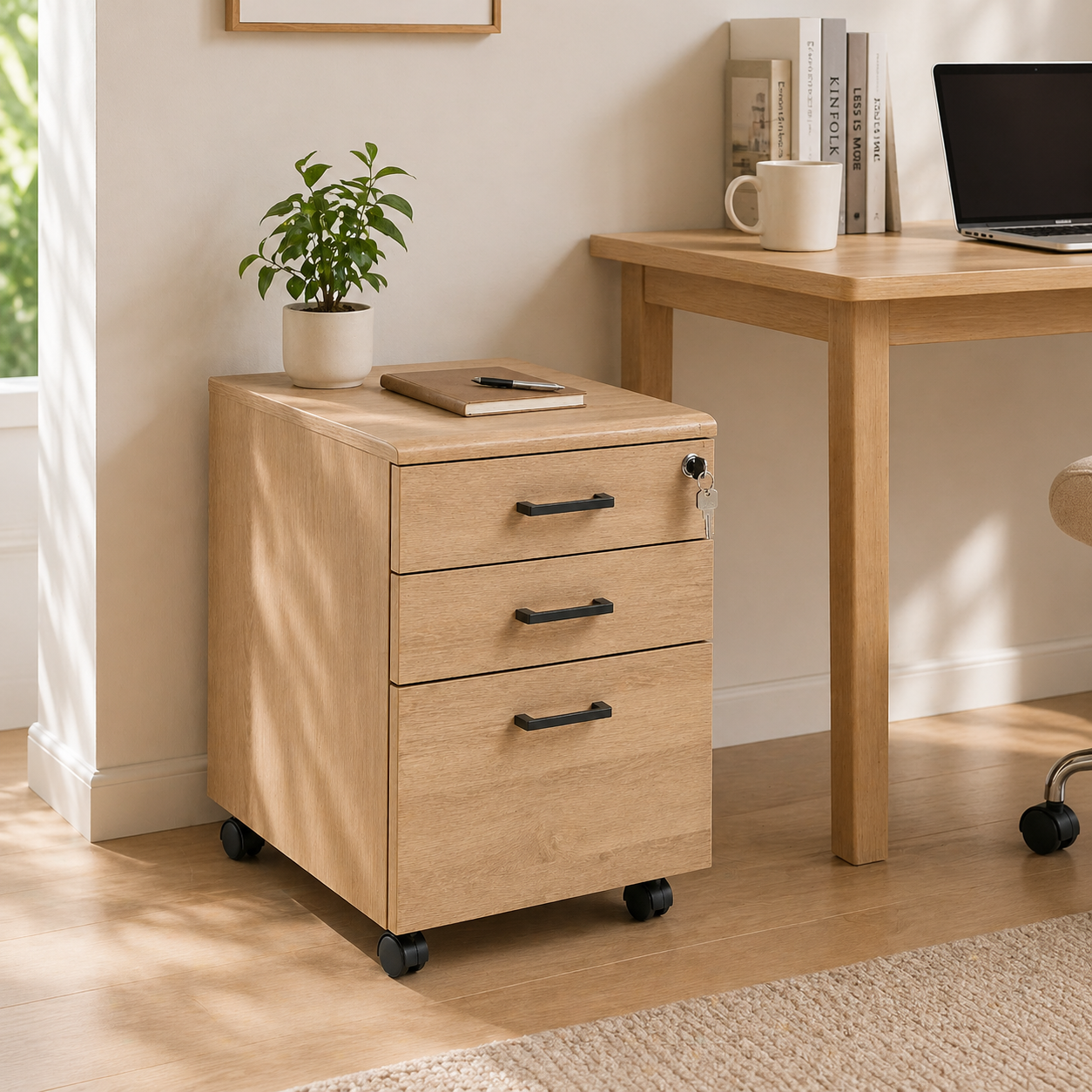 Cajones con textura acanalada que ofrecen almacenamiento práctico y ordenado.